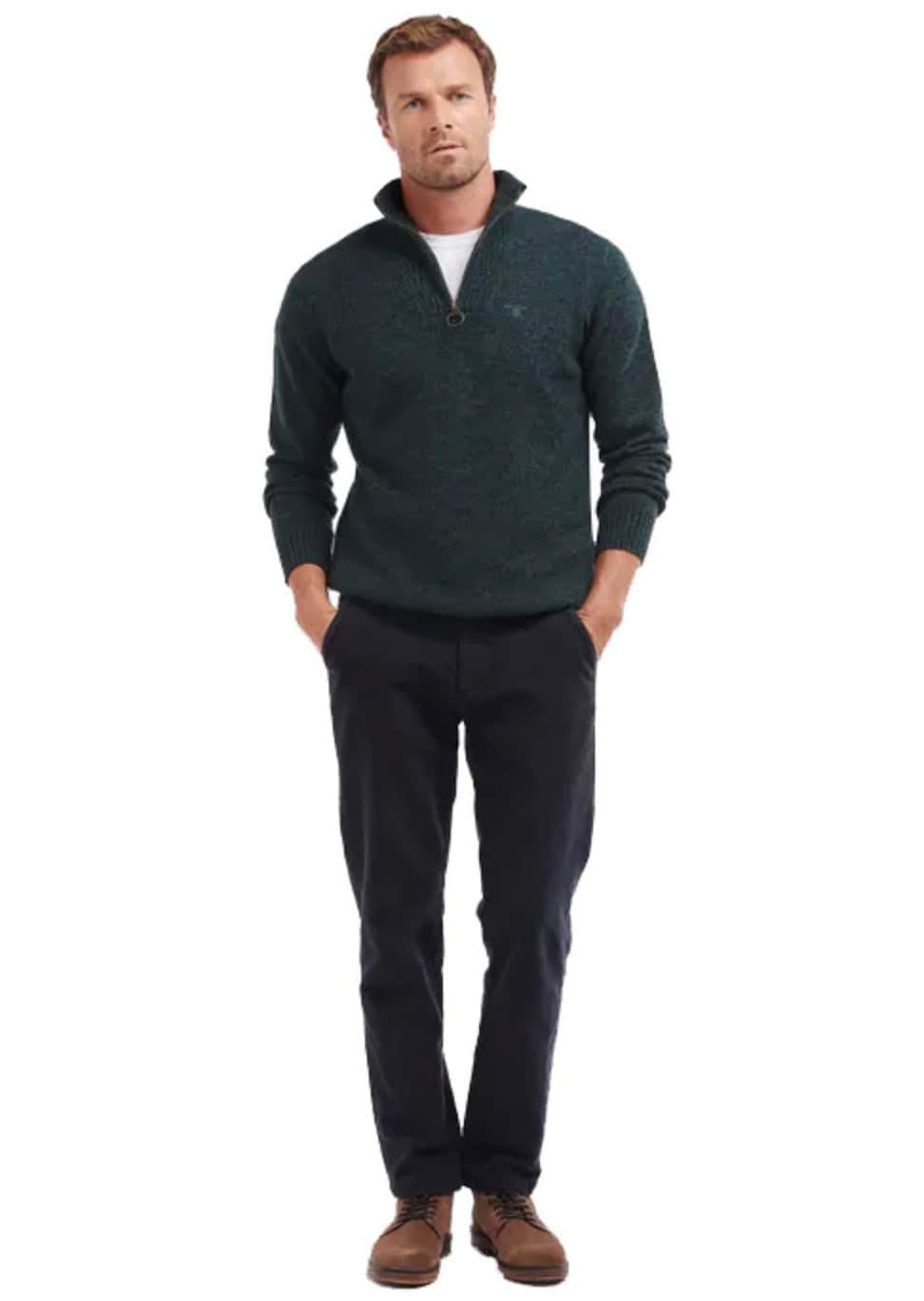 Men's Barbour Essential wool Half Zip Sweater is an essential mid gauge sweater in 'super soft' handle wool. It has rib details and a contrast colour embroidery.