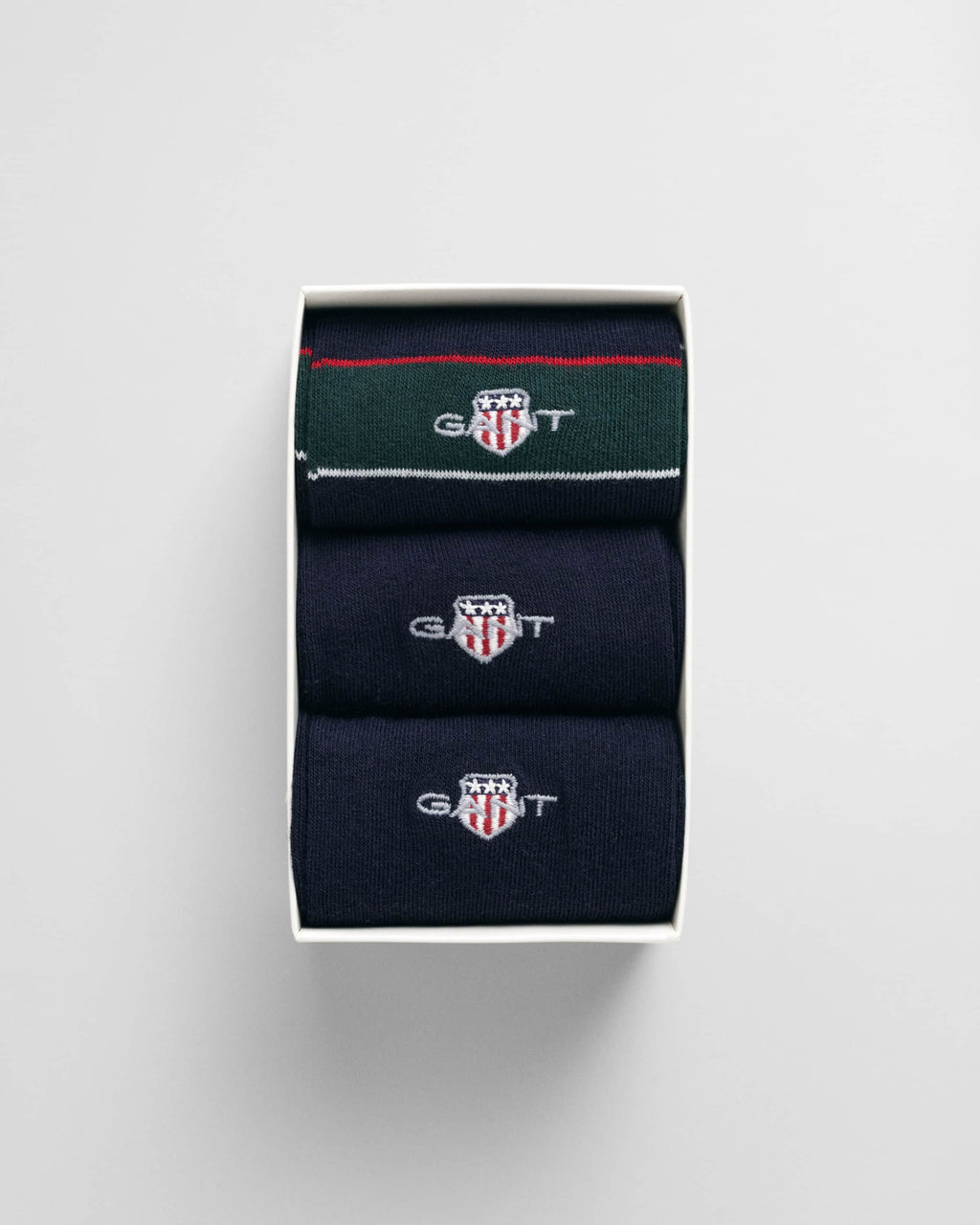 Made from a premium cotton blend, these socks feel luxuriously soft to wear. Presented in a gift box, this 3-pack includes one solid pair and two pairs patterned with the same stripes as seen on our preppy ties in this season's collection. All socks are detailed with a GANT shield graphic embroidered at the ankle.