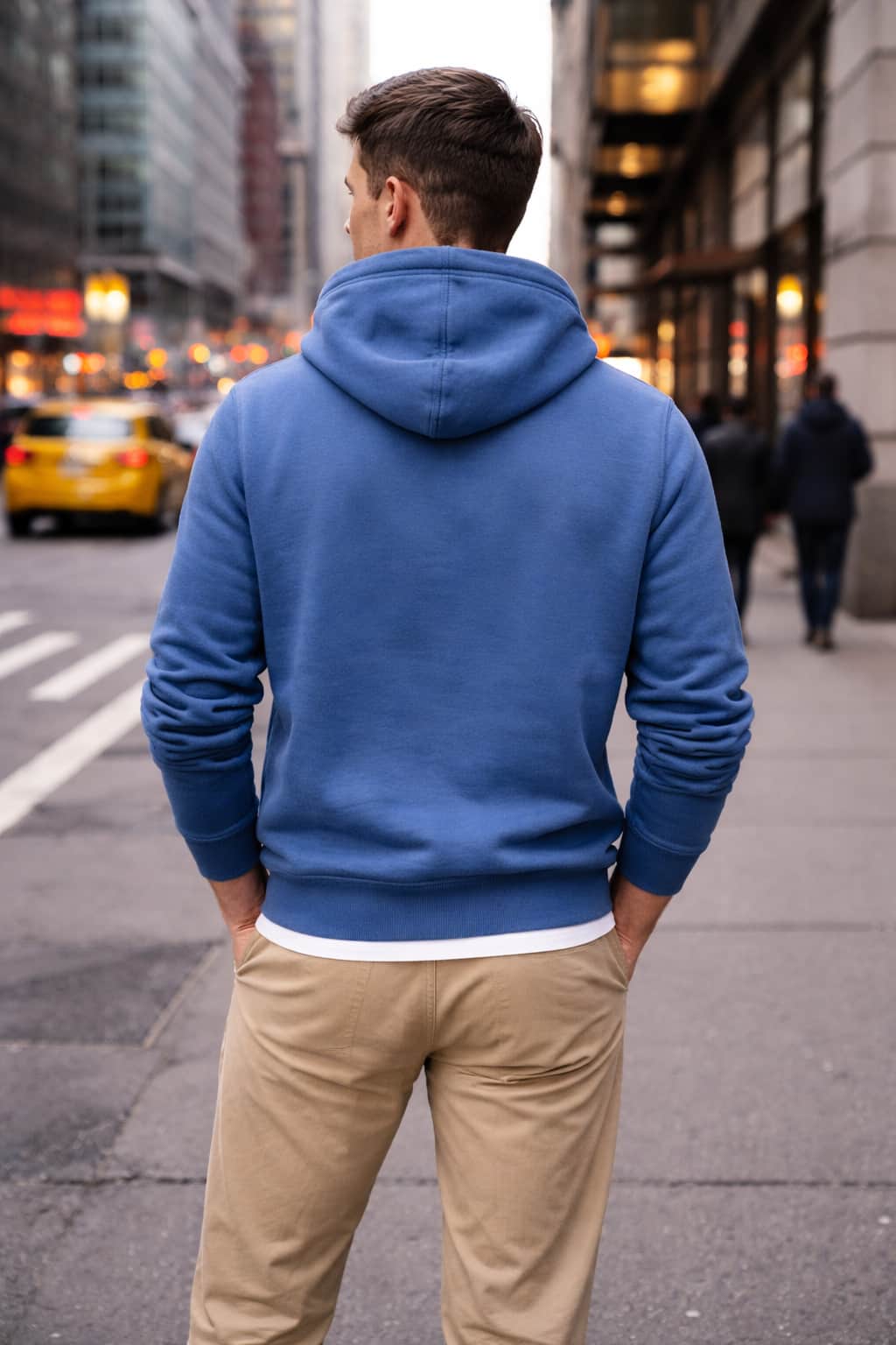 Finished with a classic kangaroo pocket for practicality and silver drawstring eyelets for a polished touch, this Vintage Blue hoodie pairs perfectly with jeans, chinos, or joggers for a laid-back yet put-together look.