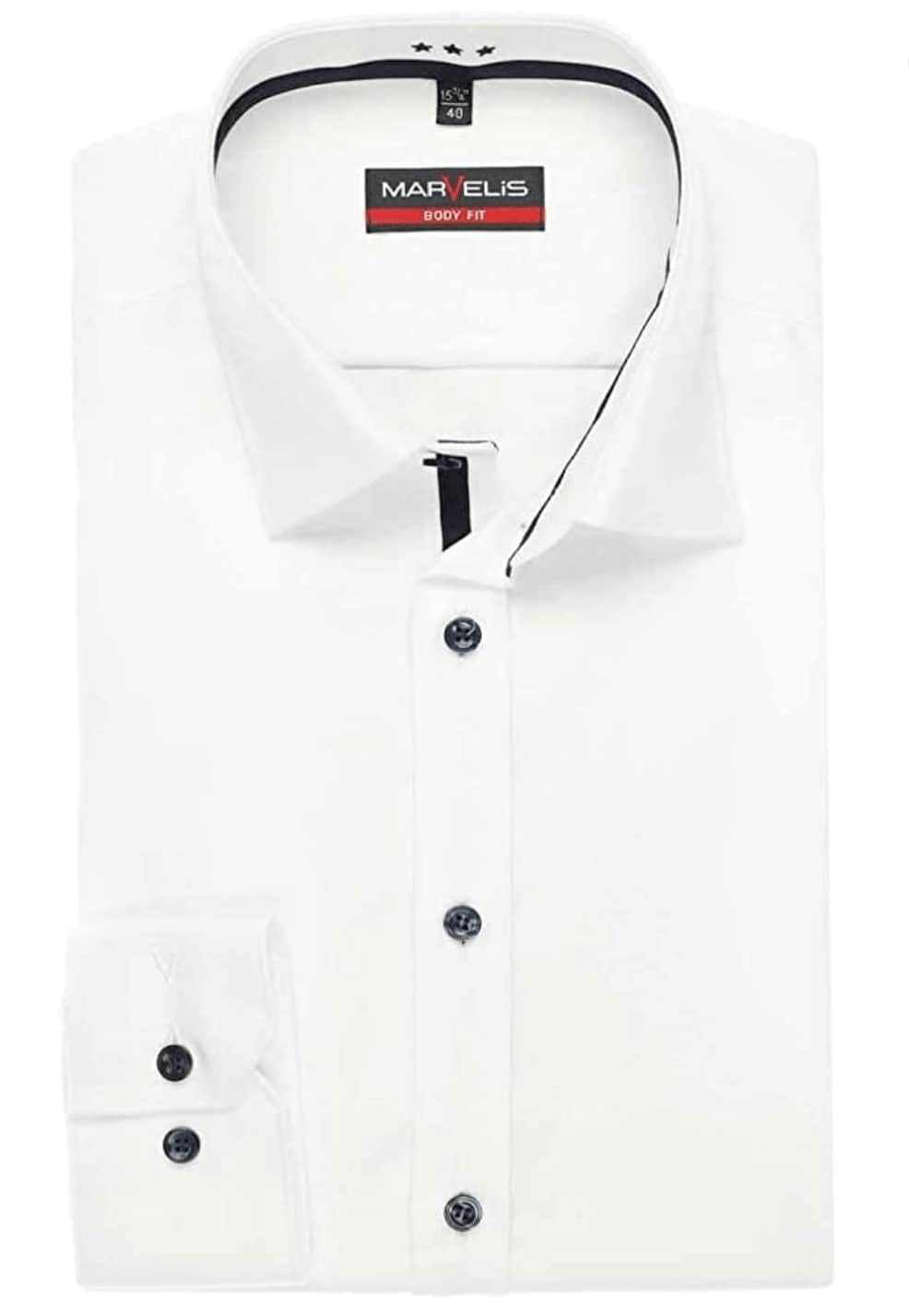 The Marvelis Body Fit shirt with a New Kent collar, in the color white - One Colour. The tapered, body-stressed business shirt with natural comfort stretch for unrestricted high wearing comfort. Dimensionally stable and particularly easy to iron.