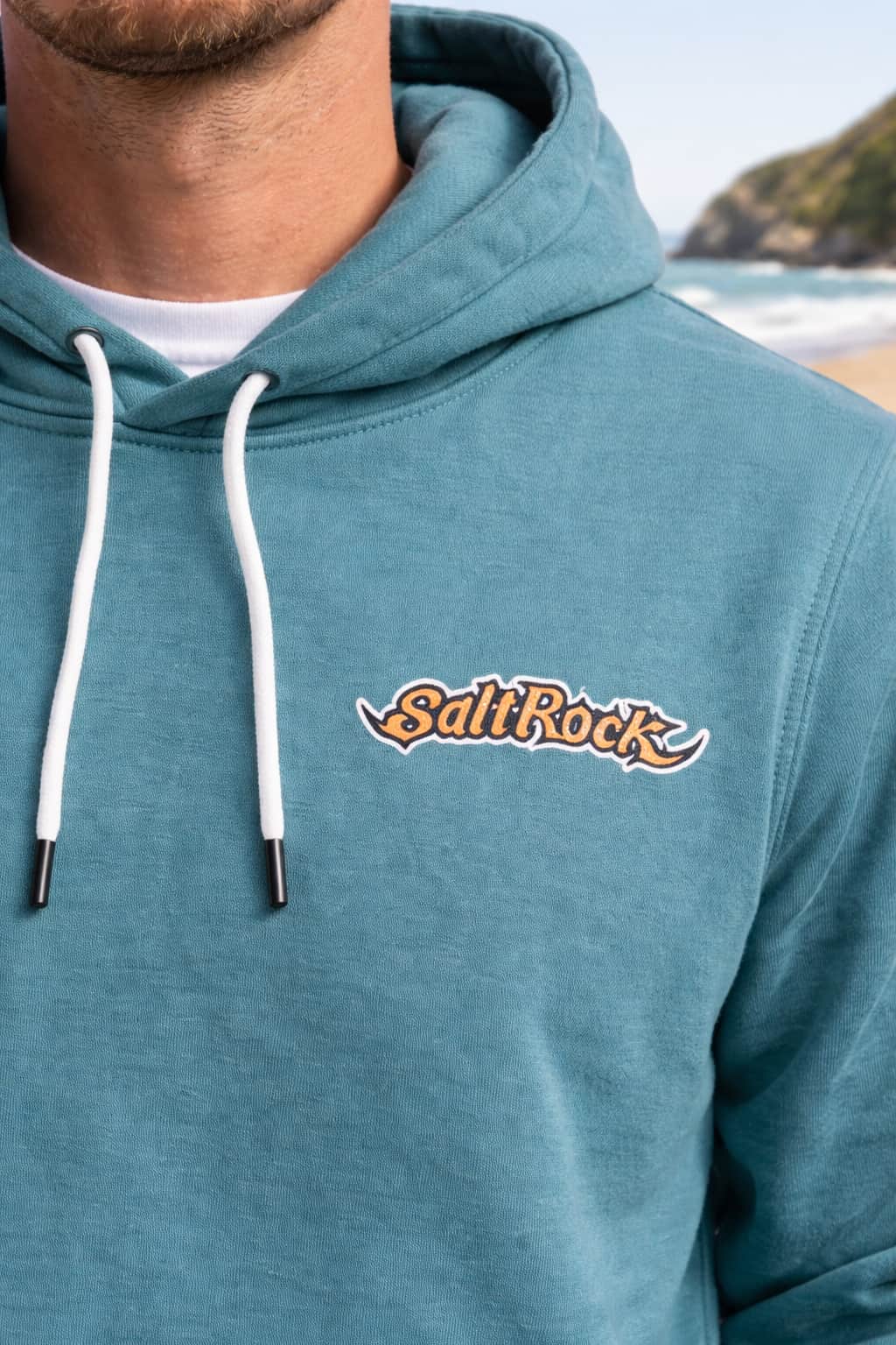 The design features a large Saltrock back print showcasing the iconic Heritage logo, giving the hoodie a bold statement finish. A small Saltrock logo print on the front chest adds subtle branding detail, keeping the overall look clean and balanced.