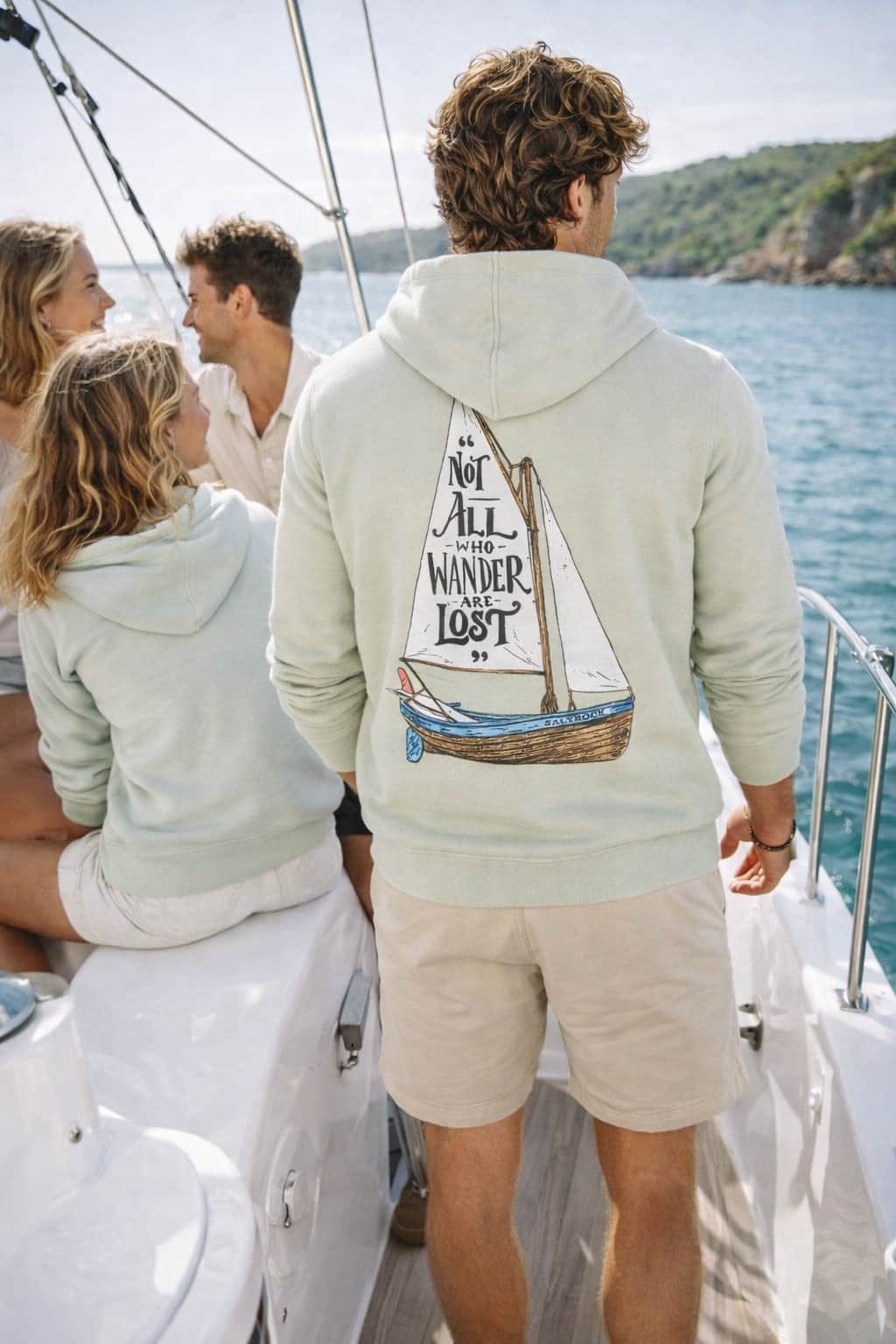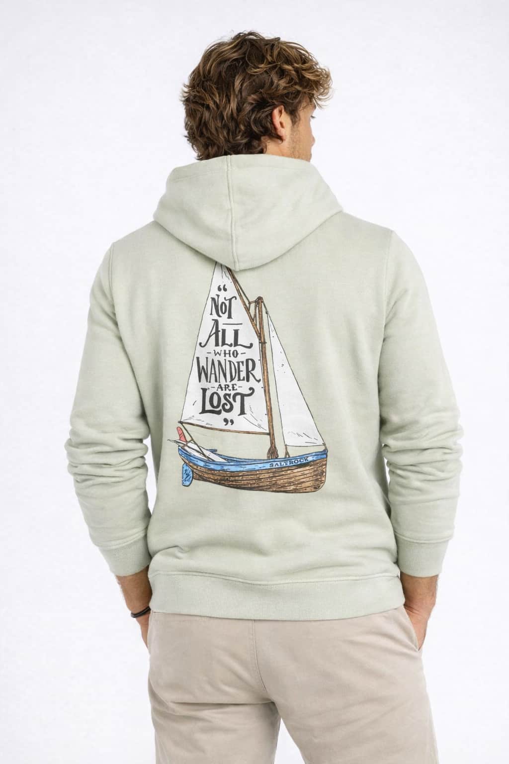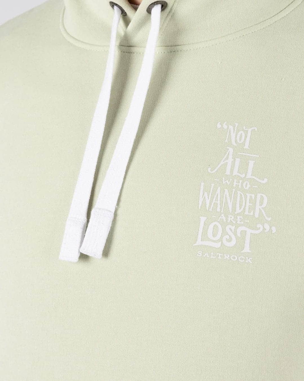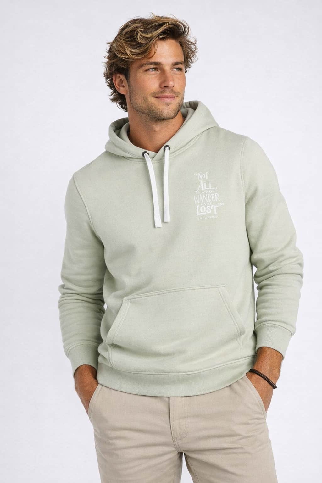 This hoodie is finished with meaningful graphic detail. The front chest print features the words Not All Who Wander Are Lost, while the back showcases a sailboat graphic with the same iconic phrase, capturing Saltrock’s coastal, free-spirited identity. A woven Saltrock label on the side seam completes the look.